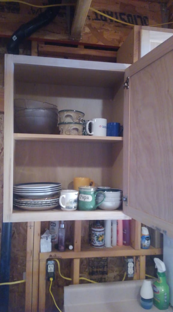 A big surprise was getting this picture... Jim put a couple of cupboards up, so I have some place to put the few dishes that we have stored in boxes and drawers.. This is going to be so much nicer. I was surprised and thrilled all at the same time... the insulation and sheet rock isn't in yet, but, I have cupboards... I realize these are going to have to be taken down when we get the four way completed, but for now, I love it.