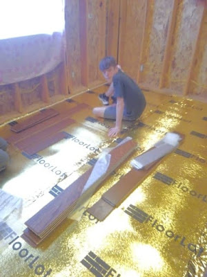 One of the big problems I have while spending weekends at the cabin was the floors. The floor is just chip board and whenever someone walks around on it in bare feet, if you are lucky, you didn't get little slivers of wood in the bottom of your feet. When one of us gets up in the middle of the night to make it to the restroom, it's not a fun feeling. So, Lowell and Chance got the job of putting down the flooring in the main level bedroom. They started by putting down the gold underlayment....
