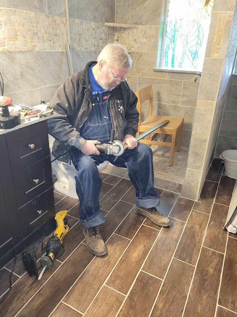 With Jim's arm still kinda of out of commission, I was really looking for jobs for him to do that didn't make him lift his arm over his head, and protecting his shoulder. Jim and Ben call me the project manager, so this was my job. The first suggestion I had was to put the hardware in place in the main level shower. Jim handed me the instruction and called them, "Girl Papers" and it turned out we really needed that girl stuff... Jim had a little problem getting everything to fit together when he realized that one of the screws was not tapped... and we had to go into town and purchase the a tap.. But, in just a little bit, he had the job completed. One step closer to having the bathroom finished.